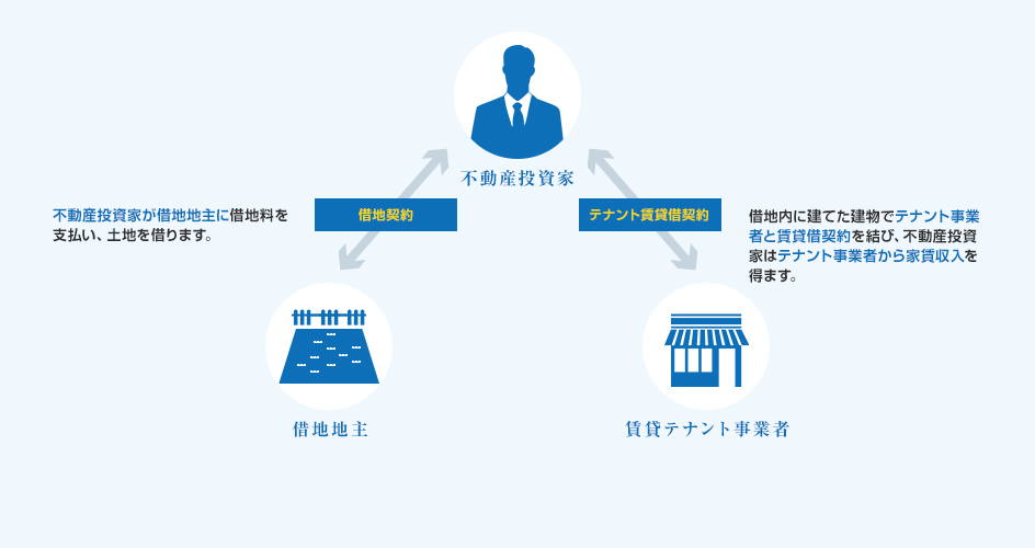 借地契約を結んで土地を借り、借地地主に借地料を支払います。借地内に建物を建て、賃貸借契約を交わしたテナント事業者から家賃収入を得ます。